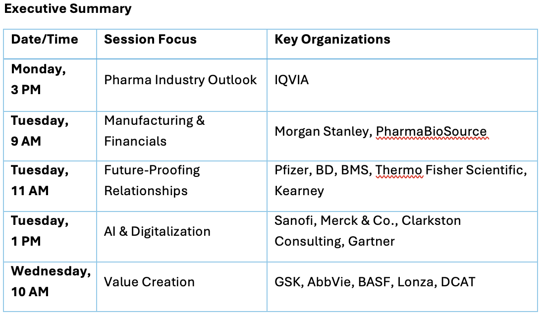At 11 am on Tuesday, a selection of company executives will share their insights into how pharma companies and suppliers can collaborate to deal with future challenges. The Future-Proofing the Pharma Customer–Supplier Relationship panel will comprise Xavier De Ceuninck from Pfizer, Ajay Nanda from BD, Troy Mathews from Bristol Myers Squibb, and Sara Henneman from Thermo Fisher Scientific, and it will be moderated by Vishal Bhandari from Kearney.